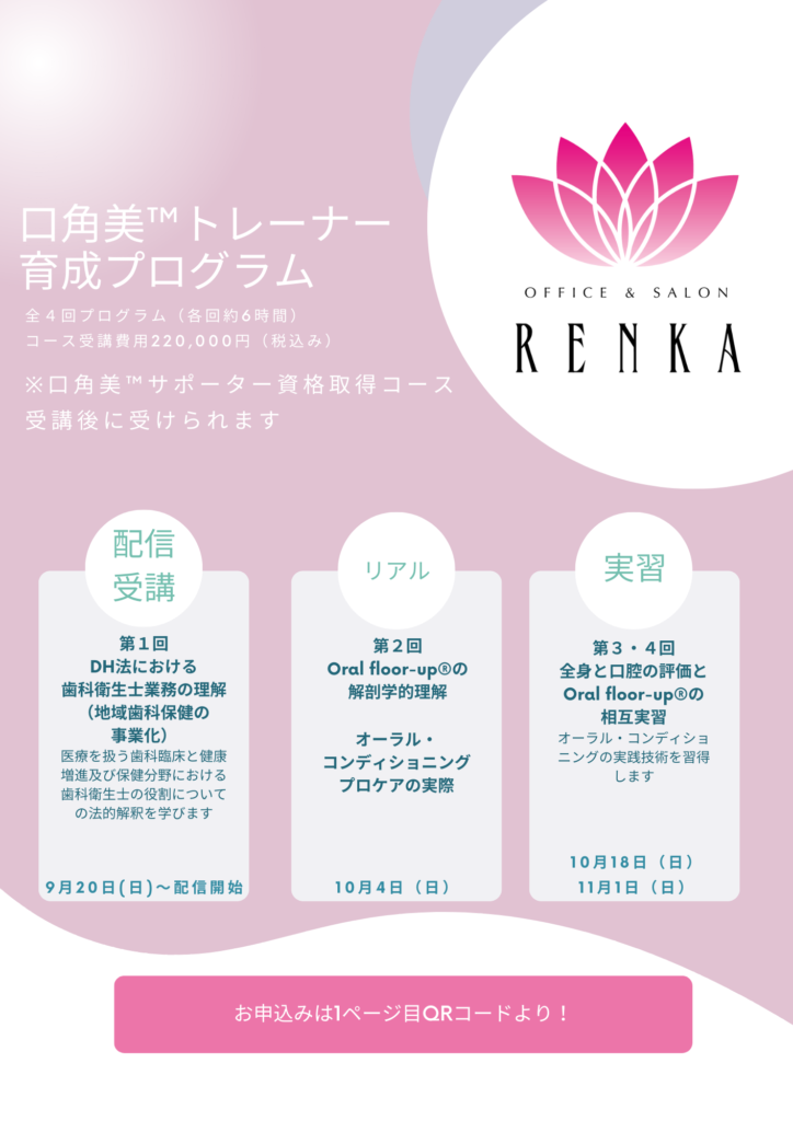 ①当社「サロンRENKA」のセルフケア指導コース(60分6,600円)または「サロンRENKA」のコース(90分別途13,200円)未経験の方は、実習までに個別にご予約をお願いします。